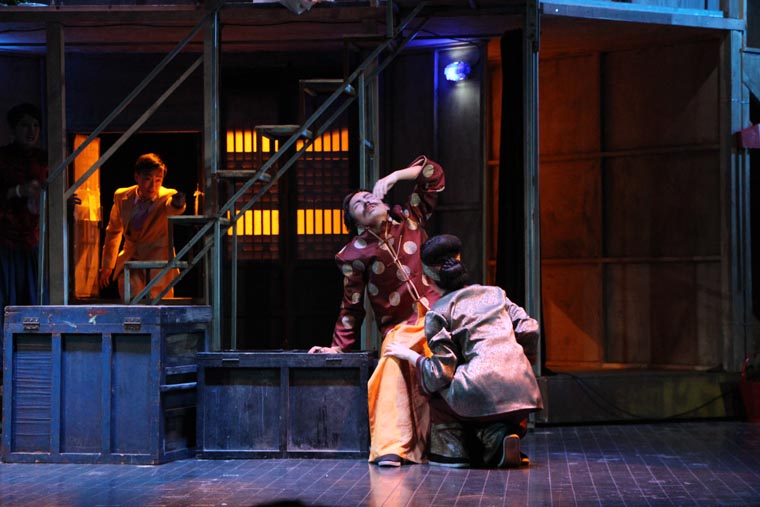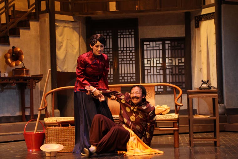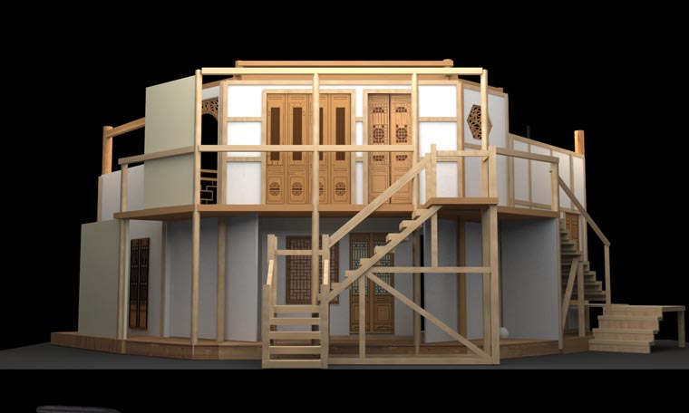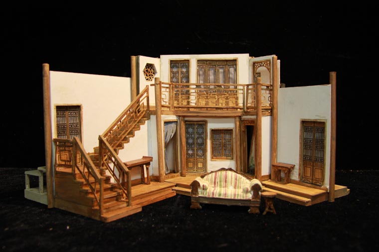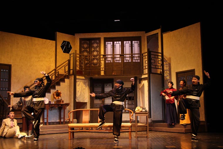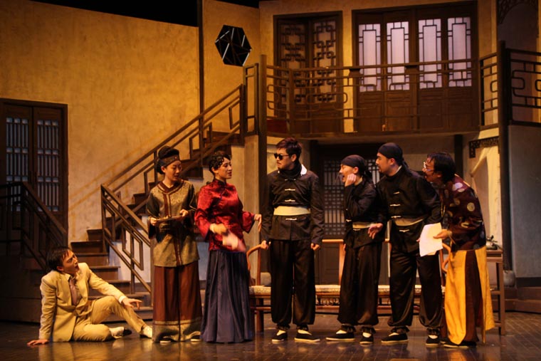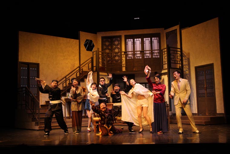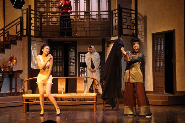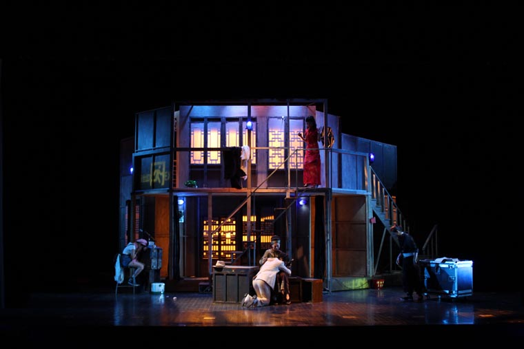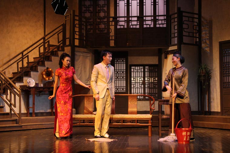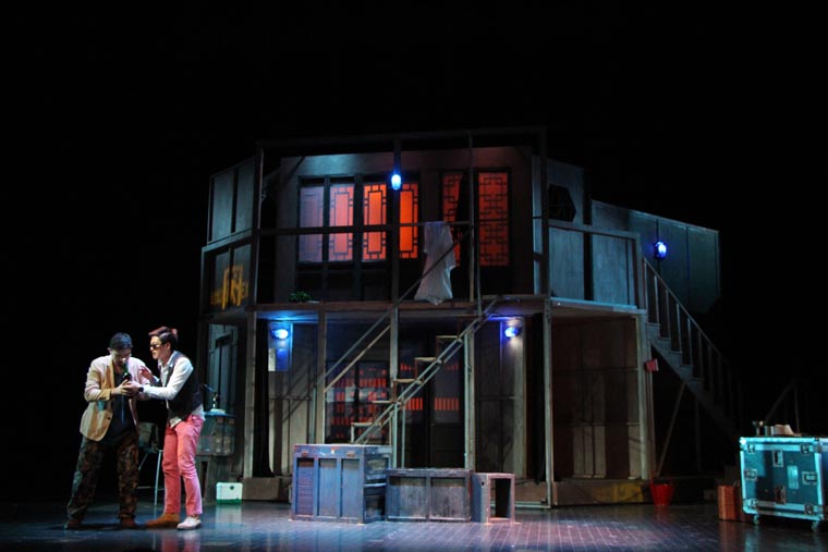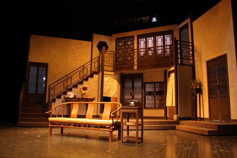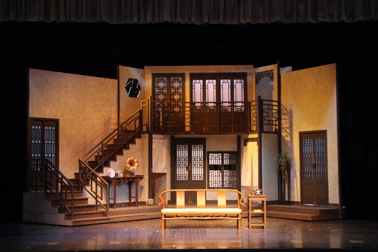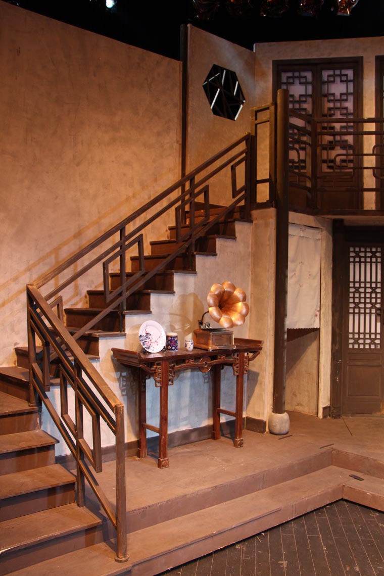 剧本从导演、表演和舞台设计方面都有着很高的要求。 它的调度十分复杂,一环扣一环犹如手表齿轮般精密。布景的功能性也很重要,九个出入口需要合理地安排在一个客厅中,也分别代表了剧中的九个角色。这对设计与制作提出了很大的挑战,不仅需要两层楼的结构,更要在第二幕时将布景旋转180度,表现剧场后台。对于端钧剧院这样一个小剧场来说,容纳这样大的布景十分困难,在没有转台的情况下,我们设想将整个布景拆分成三块,分别自转再拼合到一起。最终整台景片共用80个轮子,通过人力实现了在一分半钟顺利换景。导演组将戏中戏的背景设定在清末民初。中国化无疑使剧情更加接地气,但也给舞台设计增加了难度,因为要在保证不改变剧本要求的出入口结构的情况下,设计出完全符合传统的中式建筑是不可能的。于是我们决定将带有中国元素的门窗任意拼贴,呈现出拥挤,喧闹的视觉效果,正符合了剧本的风格。