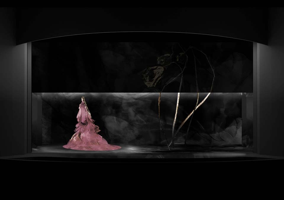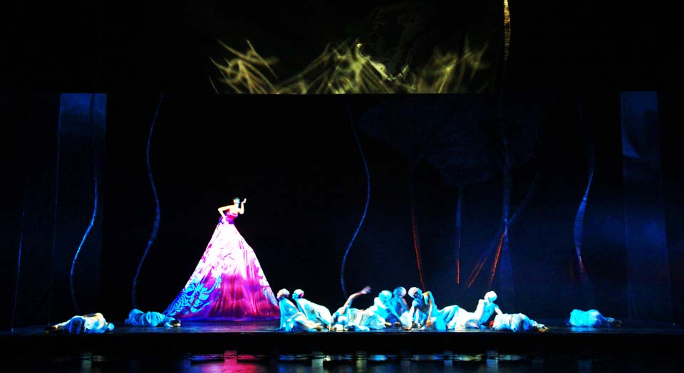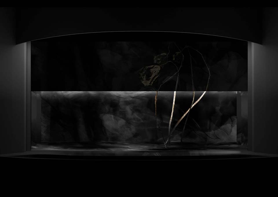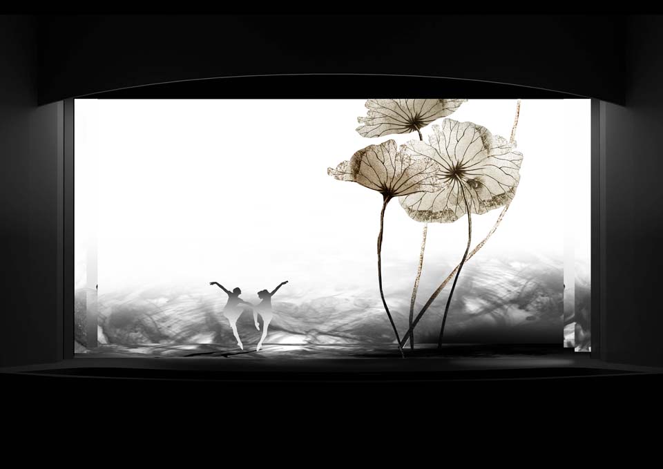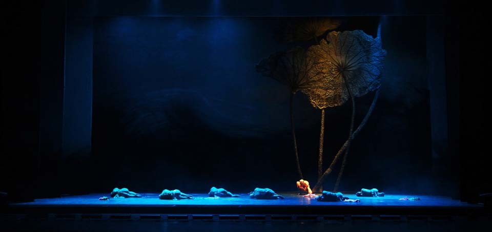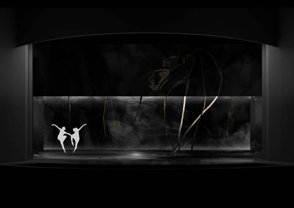 自古以来,“荷”以其高洁之姿被世人传颂,无论是画家所描绘的"接天莲叶无穷碧,映日荷花别样红"之娇媚色彩,还是文人笔下"出淤泥而不染,濯清涟而不妖”的人品观照,亦或是宗教文化中从烦恼中解脱而生于佛国净土的圣人化身,都赋予了荷花宁静、恬淡、端庄、超脱的东方文化韵味,并成为世人心中圣洁、善美的象征和我的重要创作素材。我将整个舞台沉淀在抽象水墨的泥泽中(见剧照3)。以求达到即现代又不脱离现实,既要交代给观众环境的概念,又不以常规视角还原场景。