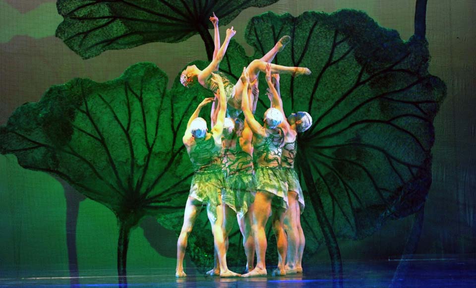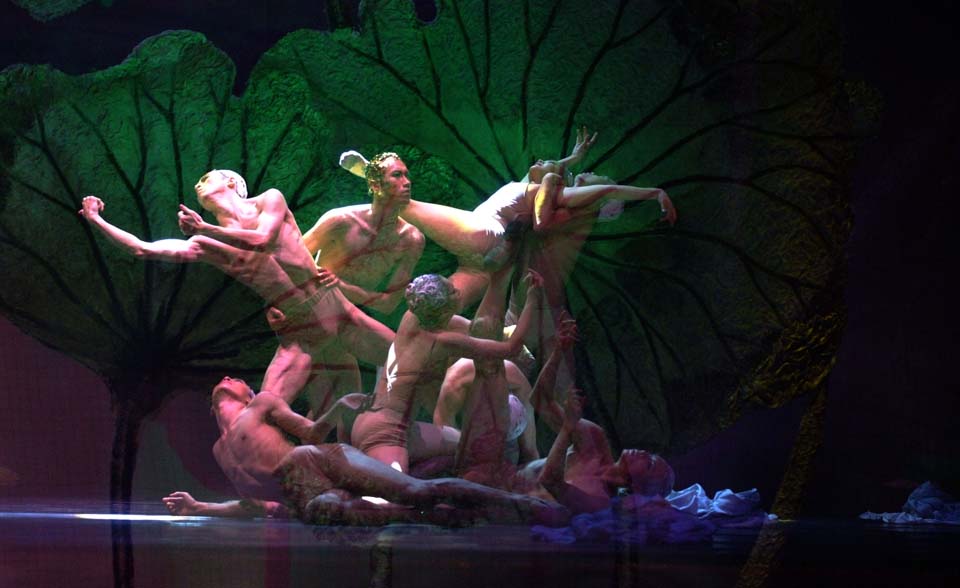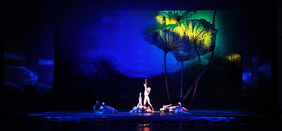 当舞台大幕徐徐开启,硕大浑圆的碧绿荷叶婉约在舞台深处,若隐若现的水纹与柔亮的灯光包围着舞台中央从地面渐渐立起的舞者,他们身着裸色服装,一点点舒展自己的身体,并在缓慢而连贯的肢体运动中为自己穿上荷叶般的外装,犹如春日的温暖逐渐唤醒莲池中的生命,荷的根茎漫出绿色,透着阵阵清凉,散着丝丝幽香。这株泥中的荷的制作是一个较长的过程,表面的肌理效果是以软织物打底,在上面喷洒了多种相触及会起化学反应的固体及液体而制成(见剧照2)。