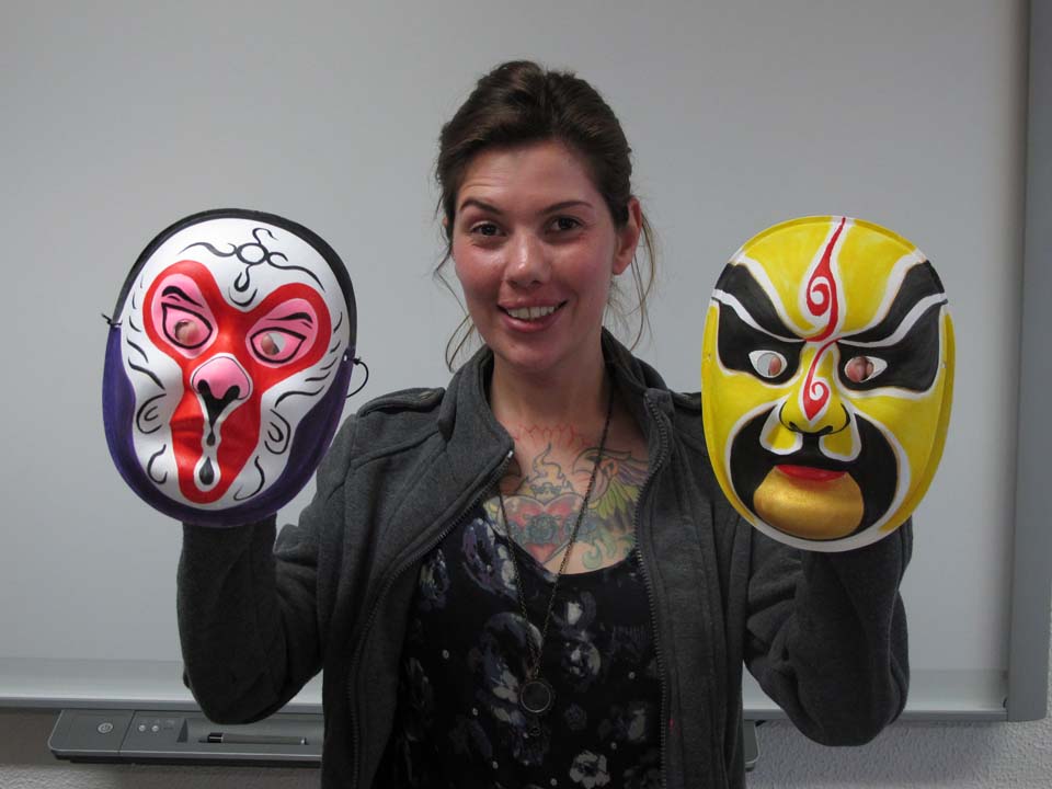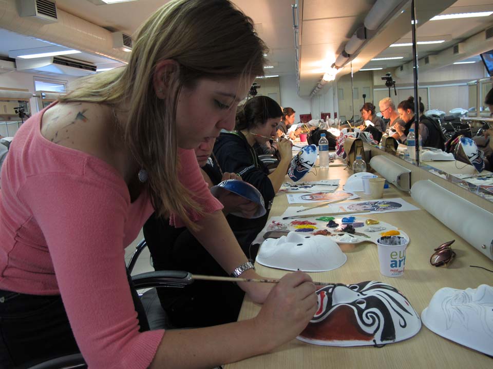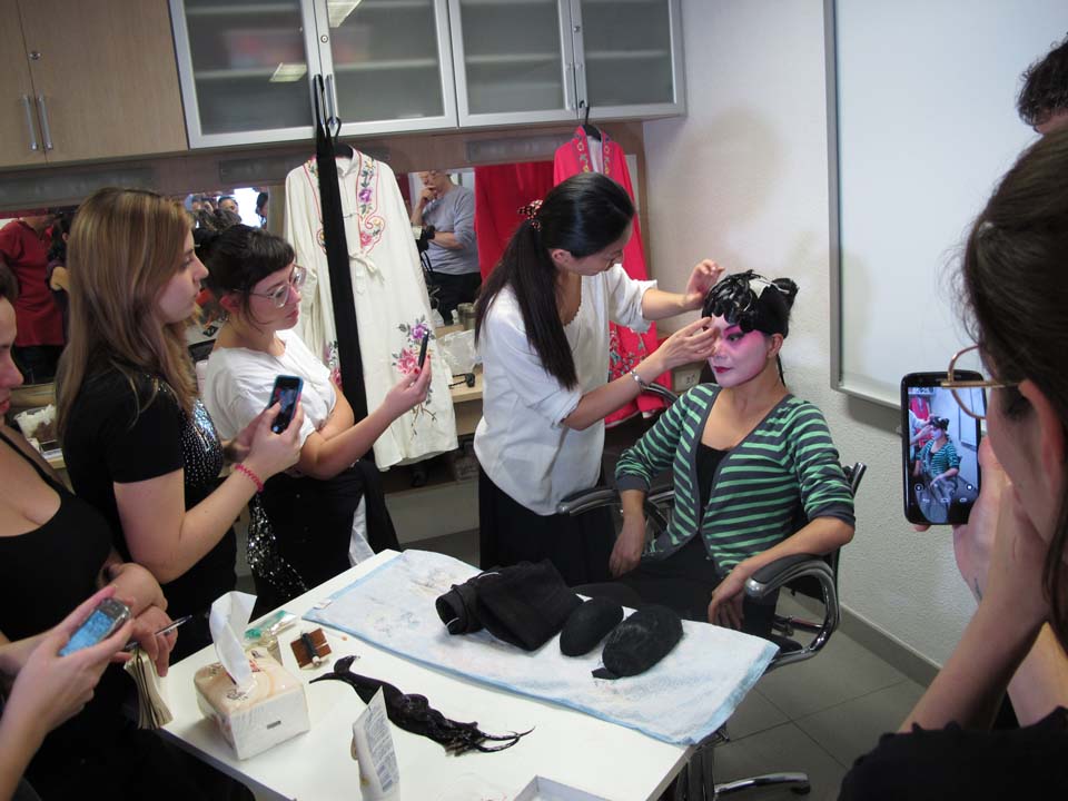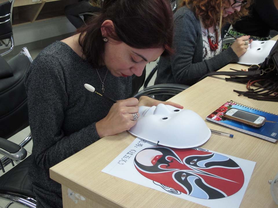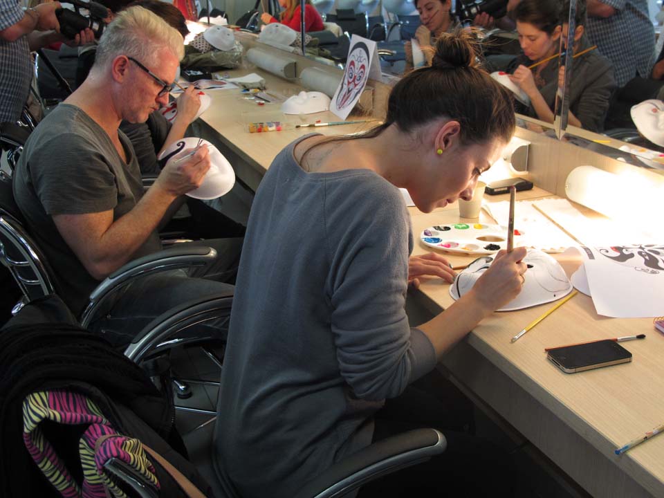第二阶段主要是京剧脸谱的描画和制作步摇的体验,吴娴老师又示范了花脸化妆和古典步摇的制作。我们沉重行李的三分之二是为工作坊的体验课程准备的材料和工具:颜料、面具、画笔、调色板、油彩、胶枪、胶棒、各种饰品、珠子、链子、服装、头面等等,看到学员们在做练习的时候,聚精会神、情趣盎然的样子,我们感叹几箱子的东西没白带。学员们在白胚面具上精心描绘脸谱、设计制作各式步摇可谓全身心投入,常常一连几个小时不休息,主管老师一再催促他们起来喝点咖啡放松一下,可是学员们都埋头制作、说不累不累,完全陶醉在学习的过程中。大部分学生的确是具有较好的技术功底,而且自学能力极强。很多学员回家还画了好几个脸谱,好几位女生表示有机会一定要去中国,要继续学习京剧化妆。