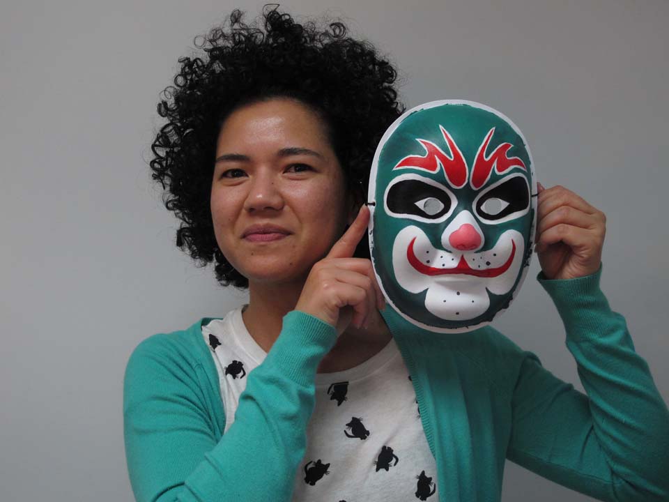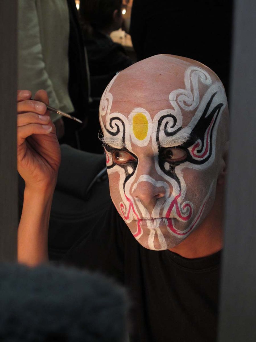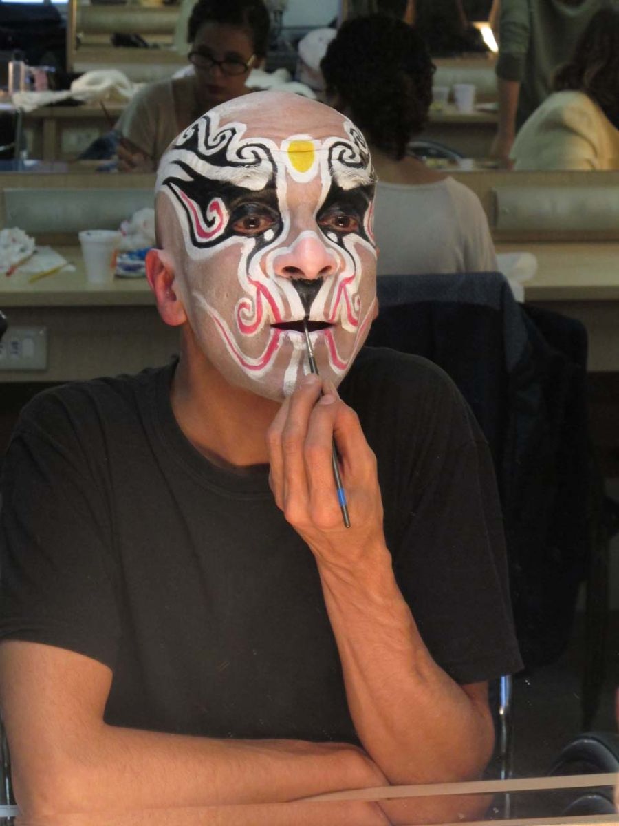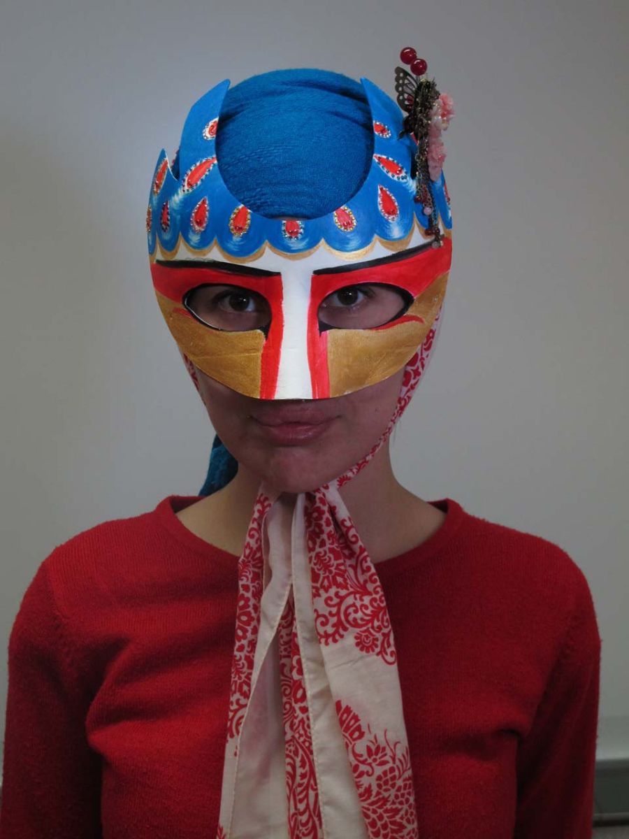 第二阶段主要是京剧脸谱的描画和制作步摇的体验,吴娴老师又示范了花脸化妆和古典步摇的制作。我们沉重行李的三分之二是为工作坊的体验课程准备的材料和工具:颜料、面具、画笔、调色板、油彩、胶枪、胶棒、各种饰品、珠子、链子、服装、头面等等,看到学员们在做练习的时候,聚精会神、情趣盎然的样子,我们感叹几箱子的东西没白带。学员们在白胚面具上精心描绘脸谱、设计制作各式步摇可谓全身心投入,常常一连几个小时不休息,主管老师一再催促他们起来喝点咖啡放松一下,可是学员们都埋头制作、说不累不累,完全陶醉在学习的过程中。大部分学生的确是具有较好的技术功底,而且自学能力极强。很多学员回家还画了好几个脸谱,好几位女生表示有机会一定要去中国,要继续学习京剧化妆。