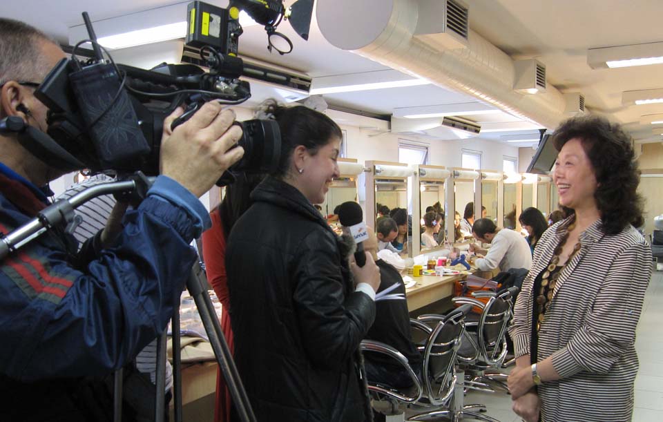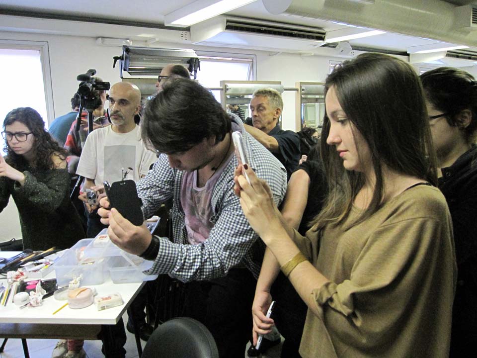 活动一开始,徐家华教授介绍了我们关于此次工作坊的构思以及想法,同时倾听和了解了学员们的看法,为接下来几天的工作打下了良好的基础。徐家华教授用生动轻松的语言深入浅出、图文并茂的讲了主题为“美丽的中国京剧”的讲座,向巴西的师生介绍了中国京剧艺术造型的特点,京剧服饰与脸谱的独有魅力。在国内出发前,徐家华教授就对课程内容做了细心安排,因为这次的授课对象是远在南美,对中国的京剧艺术所知甚少的学员。徐教授一再强调“生动易懂”是关键。接着由吴娴老师示范了一款京剧花旦造型,过程中分享了很多的实践和经验。经过老师们的仔细讲解和示范,热情好学的巴西师生对美丽的中国京剧服饰与奇特的化妆艺术充满了崇拜和喜爱,他们不停地在笔记本上画着记着,惊讶的发现原来花旦美艳的发式是通过复杂的步骤完成的,并非他们原来以为的假发套。有的学员还主动参与体验戏曲“刮片子”这一技术要求较高的内容,学员们认真又活泼的课堂表现给我们留下了很深的印象。第一阶段的教学反响很好,也推进了此次工作坊的主题。