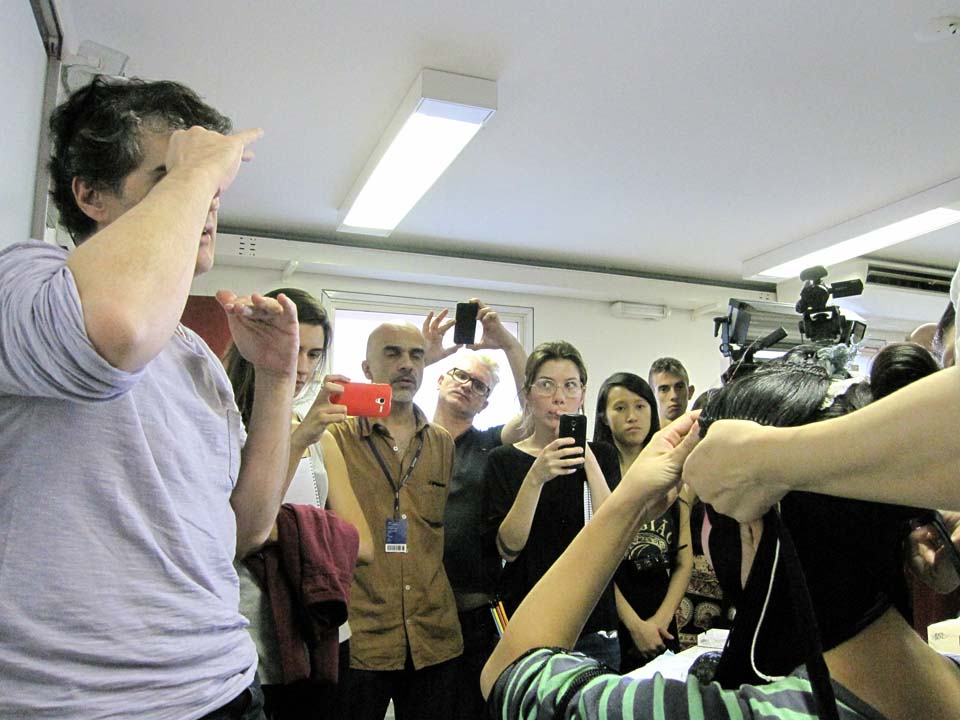 透过实践体验的过程,我们和学员们也拉近了彼此的联系,推进了活动的顺利进行。第三阶段工作坊教学先讨论了前阶段学员们所体验到的一些感受,通过总结汇集之前学员们所做的工作,大家开始着手于最后所要进行的本次研讨会的展示工作。通过讨论以及不断的调整,大家最终确定了展示成果的方式。这一阶段我的讲座是——时尚与京剧造型,分析总结当前各领域运用传统戏曲元素所做的时尚设计的设计思路与要点。尤其是讲解了上戏的学生如何将传统戏曲元素用在时尚造型设计之中。展示了上戏学生的“着色”作品,这些美轮美奂的“着色”作品图片让巴西师生赞叹不已,纷纷拍照录像。