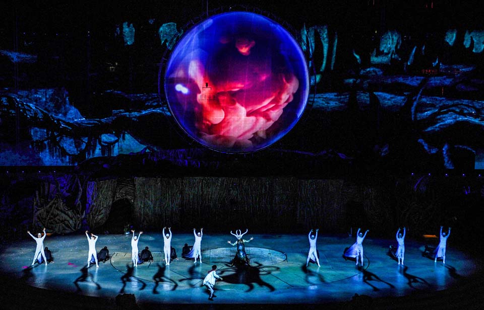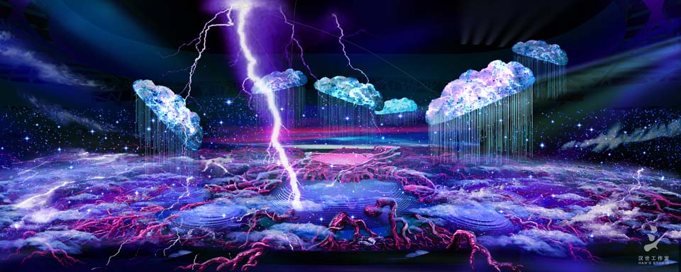 韩:我刚刚结束了《吸引》的设计工作。这个戏剧作品所探究的主题是生态文明,它描绘了自然、人类以及人造环境三种力量之间的动态关系。通过对多媒体以及对国家体育场空间特点的利用,该设计给观众提供了微观和宏观两种观察世界的视角。我对于演出的实际呈现感到非常满意,并且很高兴自己在这次设计经历中收获良多。
