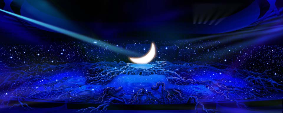 考虑到这片空间的独特性——平坦和广袤——而且大量的观众将会从地面的高度远远地观赏这次演出,我架起了一座形似奔马的脚手架舞台,刻意强调舞台的高度,并在那座长140米,高42米,深60米的脚手架装置上镶满了LED的面料板。这样的设计,鼓励导演在构思舞台走位时去探索垂直向调度的可能性。当观众进入这个空间的时候,他们举目所见的是在深蓝色天空衬托下的一匹奔马的高大身影。随着演出的进展,他们将欣赏精于马术的内蒙族人一个个动人的民间故事。