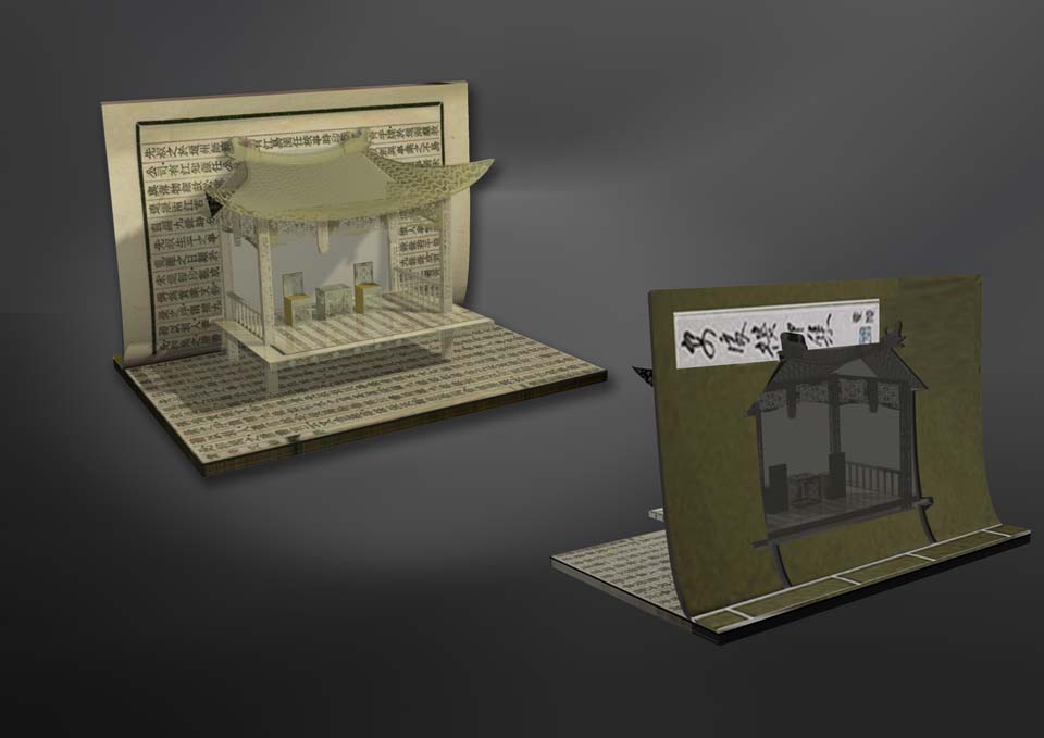该设计的另一个方案则是将中国传统戏折子的唱本和剪纸艺术相结合。中国传统的戏单通常是用一张长条的纸或是编织起来的竹签或芦苇做成的。通常,这张戏单会被折叠几次,样子变得像手风琴一般。在这个设计方案中,观众首先会看到戏单的封面,接着这个封面会演变成一张戏曲表演的二维剪纸,然后这张二维剪纸又会幻化成一个上演着真实剧目的三维剪纸的国剧场。随着演出的进行,舞台装置会自行变化。观众会欣赏到另一幅剪纸所开启的另一部剧目。一部部短小的剧目将会一个接一个地突然出现,就像从一个大包子里跳出来一样。随着包子皮一层又一层地剥落,剧目也一一上演。可惜的是,最终被核准的设计方案和这个最初的想法大相径庭。