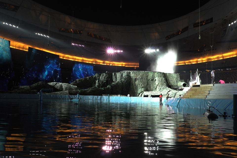 韩:当建筑师和工程队开始为“鸟巢”搭建地基时,我们的创意组就开始和他们合作了。我们对于“鸟巢”建筑设计的最大投入是关于体育场的地下层设计。因为我们需要解决为演员提供上下场出入口的实际问题,所以我们要求在体育场的地下层建造一个长方形的结构。由于那时体育场的设计方案还没有最终敲定,我们无法提出任何具体的建议。但是,从一开始我们就知道,体育场建筑设计的本身会在很大程度上影响我们的演出设计方案,并且在我们开始构思作品时,我们就需要充分利用那些给予我们的既定条件。