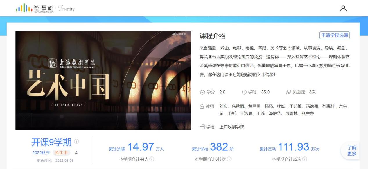我校开设的“中国系列”课程——《艺术中国》探索以大文化的观念引领学生对中国文化艺术发展现状及未来的认知,该课程已建设成为首批上海高校优质混合式在线课程,在智慧树平台面向全国开放,至今已运行9个学期,累计选课学生14.97万人,累计选课学校382所。2021年度选课学生29647人,选课学校177所。