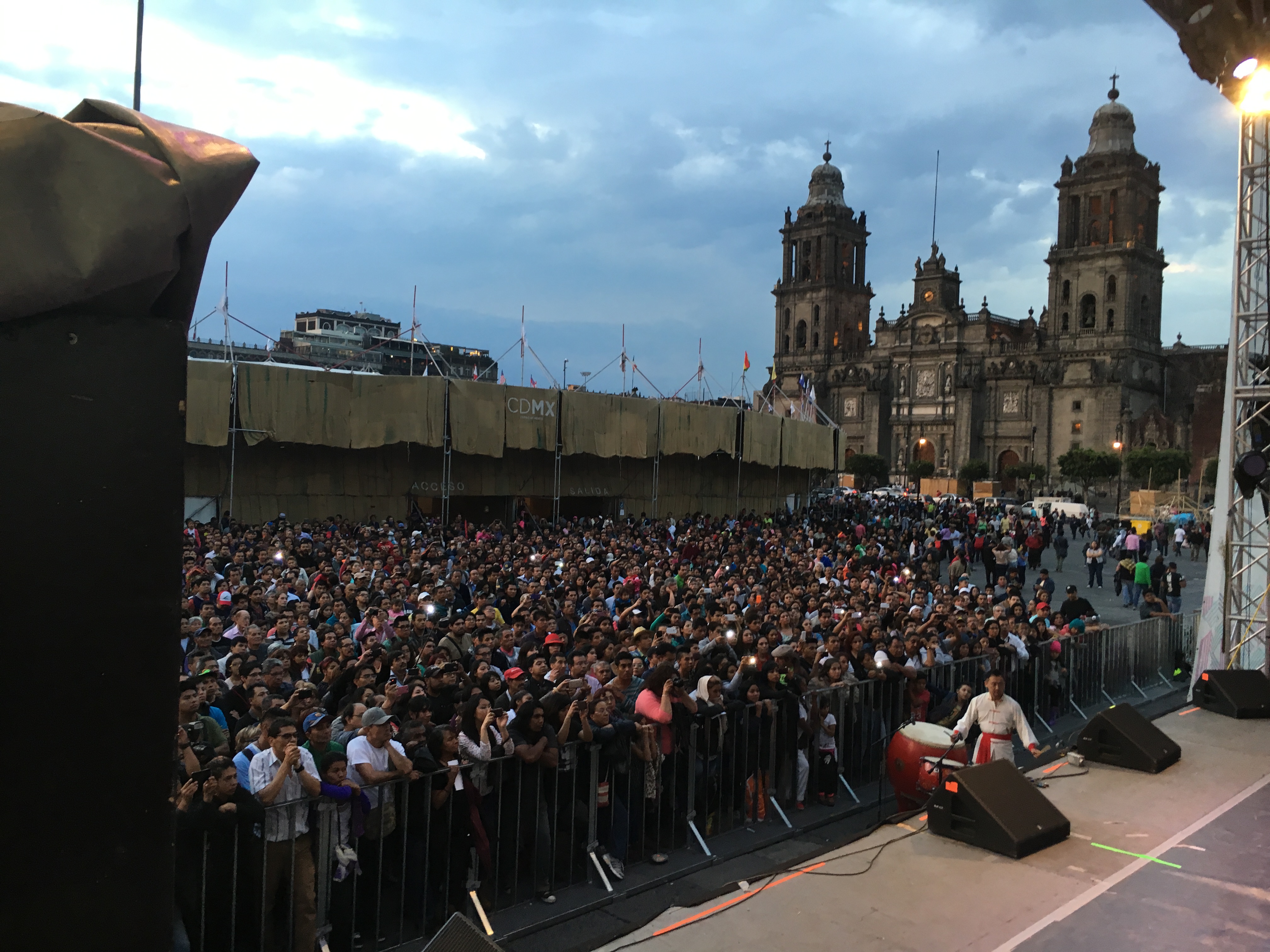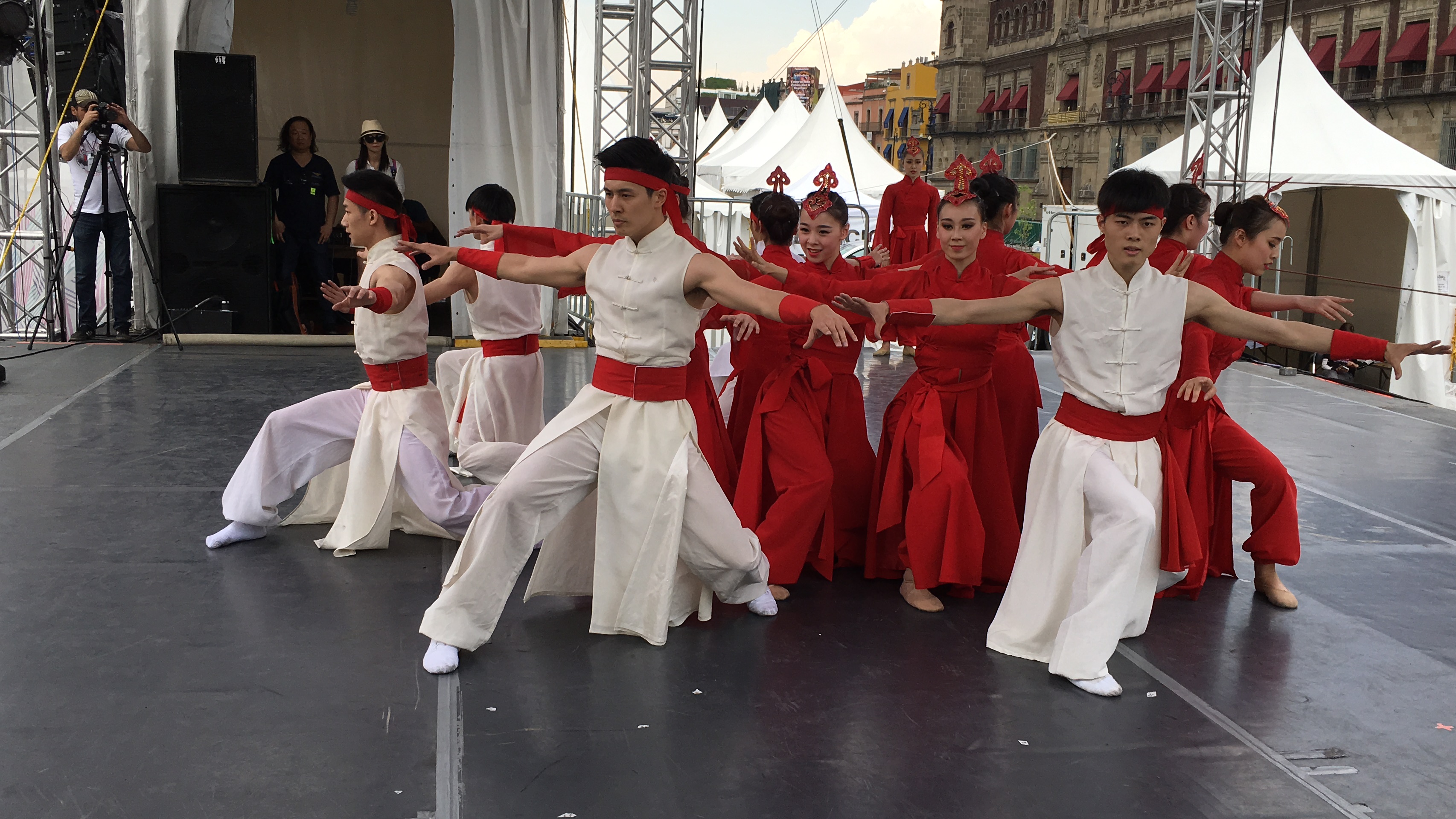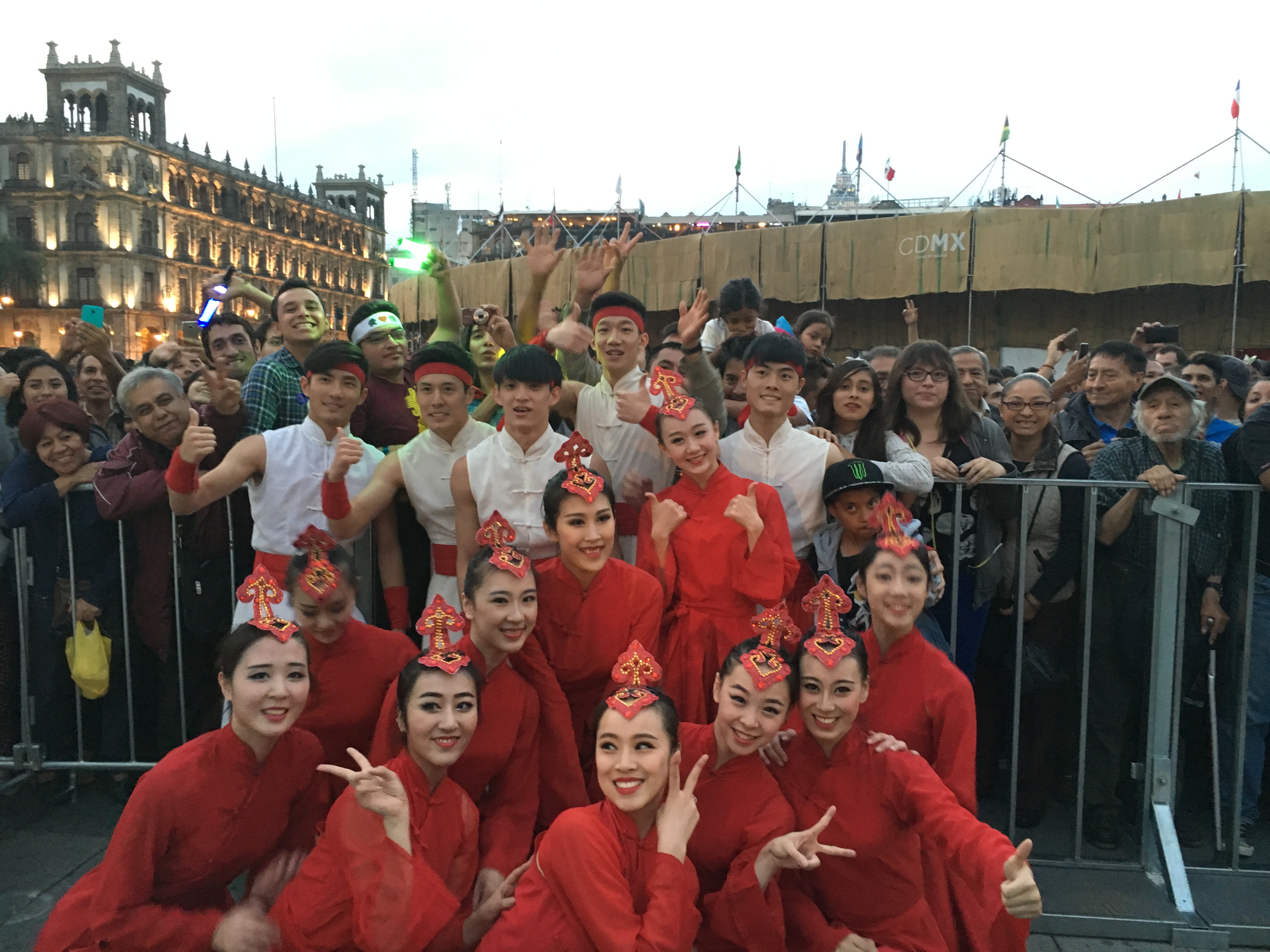 演出团抵达墨西哥城后,已于5曰31日在宪法广场举行了一次公益性的广场活动。当天虽然天气炎热,但随着演出的不断深入,观众被嘹亮歌声和优美的舞姿吸引,不断聚集,达到近两千名观众。台上演出精彩,台下人头攒动,互动热烈,掌声不断。在演出结束后,观众更是久久不愿离去,纷纷要求与演员合影留念。尽管语言不通,但观众的热情表达了他们对演出的喜爱,也感动了上戏的师生演员们。他们觉得能在墨西哥这片土地上传播中国文化,是一次难得的文化之旅,倍感自豪。