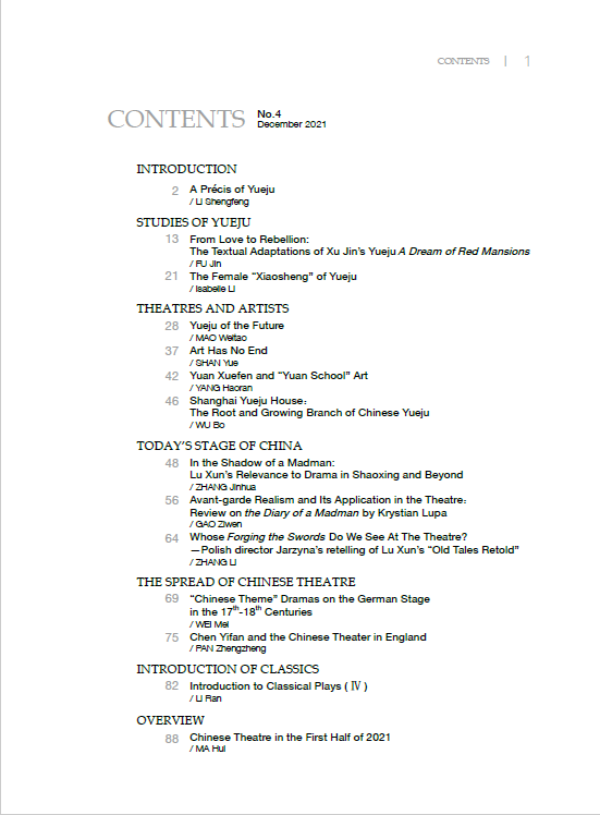 全英文刊物《Chinese performing arts》(《中国戏剧》)杂志为外国戏剧研究中心与国际剧协合作创办,旨在向世界推广以戏剧为代表的中华优秀表演艺术,刊载国内外有关中国戏曲、中国当代话剧等领域的学术论文及介绍性文章。第四期杂志主要以越剧为专题,聚焦越剧在当代舞台的发展与研究。