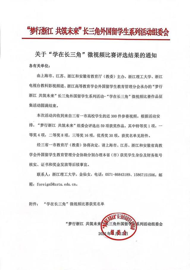 本次活动共收到来自上海、江苏、浙江、安徽“三省一市”高校学生的近300件参赛视频,评选出59项获奖作品,其中特等奖1项,一等奖4项,二等奖8项,三等奖16项,优秀奖30项。我校留学生的创作能从众多作品中脱颖而出,实属不易。