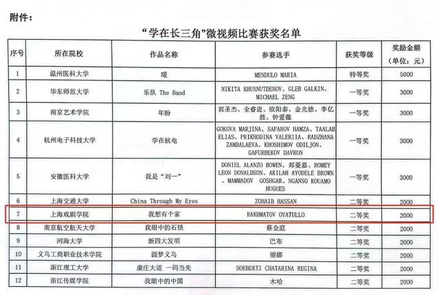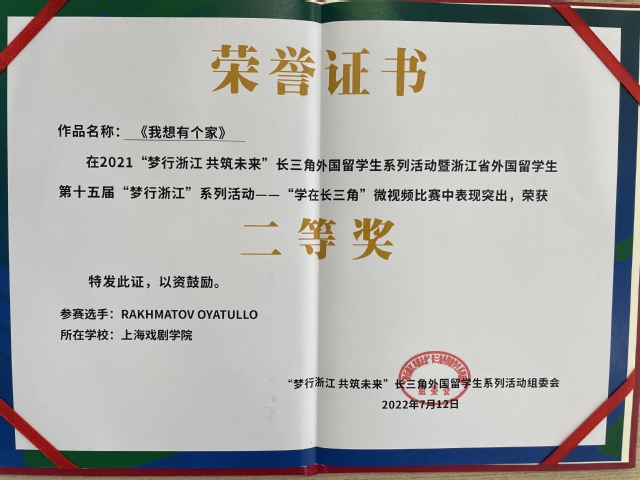 近日,由上海市、江苏、浙江和安徽省教育厅(教委)主办的“梦行浙江 共筑未来”长三角外国留学生系列活动之“学在长三角”微视频比赛圆满结束。我校塔吉克斯坦留生RAKHMATOV OYATULLO 作品《我想有个家》喜获二等奖。