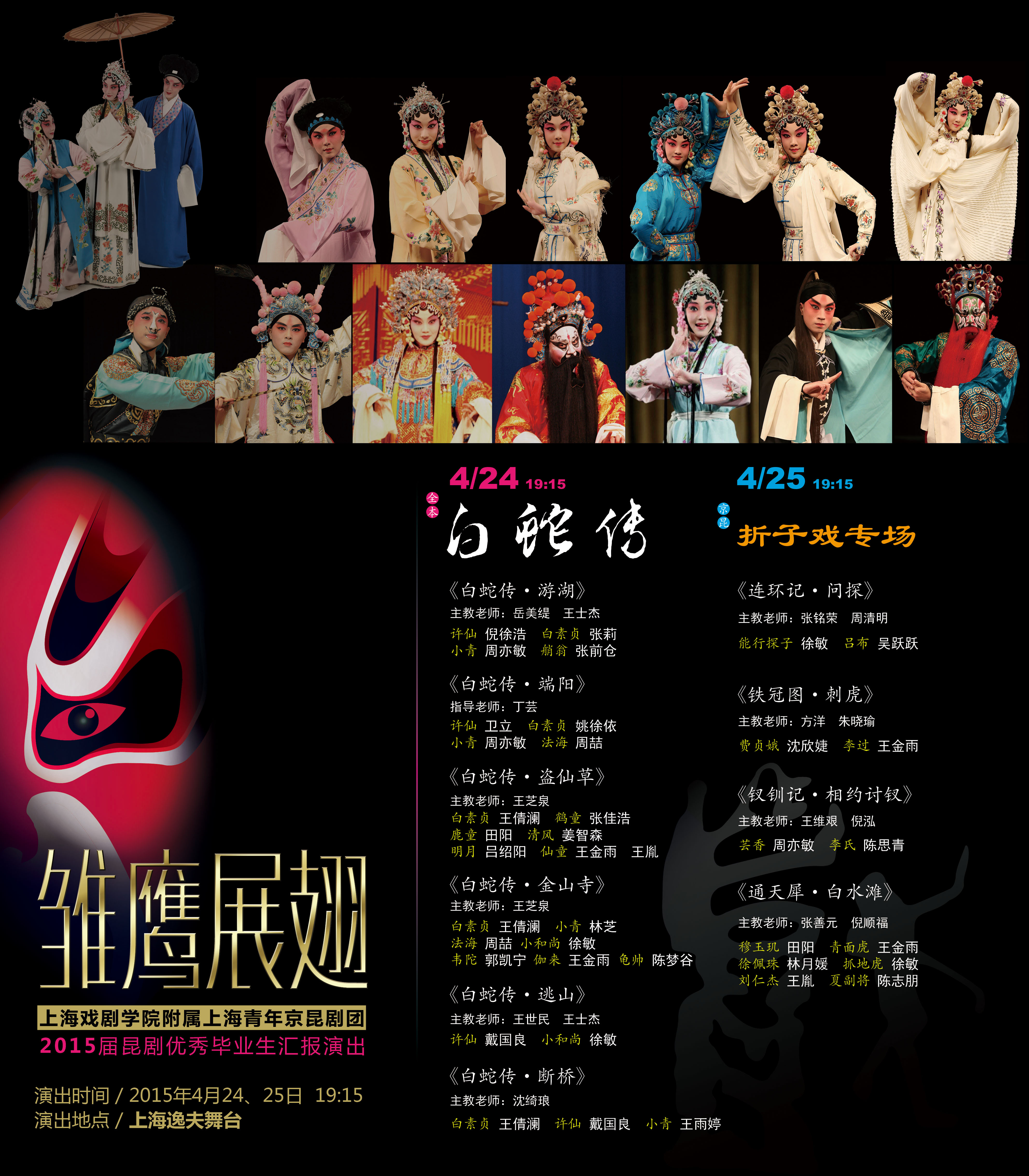 此次演出汇报的剧目分别为:全本《白蛇传》与京昆经典折子戏。是“昆五班”(小班)毕业前向广大群众和戏曲爱好者的一次总结性的汇报。所谓“昆五班”,是上海市戏曲学校先后培养了四批昆曲演员之后,2005年在全国范围内,从四千余名应考者中,一共录取了六十名学生,他们被称为“昆五班”。这是为上海昆剧团定向培养的具有大学本科学历的昆曲演员,亦是全国率先采用十年一贯制的培养模式,探索中等教育与高等教育相贯通的昆曲班。“昆五班”学生完成中专阶段学习后,分别于2010、2011年进入开云足球首页官网下载戏曲学院学习。此次汇报就是2011年入学的“昆五班”小班。该班历经近三个月的排练,由王芝泉、岳美缇、方洋、张铭荣、周清明、王士杰、沈绮琅、王世民、张善元等京昆名家担任主教老师,由2015届的优秀毕业生担任主演,以出色的唱念做打征服了全场观众。其中王倩澜饰演的白素贞,《盗仙草》和《金山寺》两折昆曲戏,充分体现了她精湛的身上功夫,高难度的翻打与出手,赢得了观众一阵阵的叫好声。后一折京剧《断桥》,也体现了她文武并重的特点,嗓音透亮,唱腔百转千回,刚柔相济。作为一名昆剧班的学生,将京剧演绎得如此淋漓尽致,可谓是令人惊叹。除此之外,其他优秀毕业生也将自己的拿手好戏,呈现给了广大戏曲爱好者,赢得阵阵喝彩。