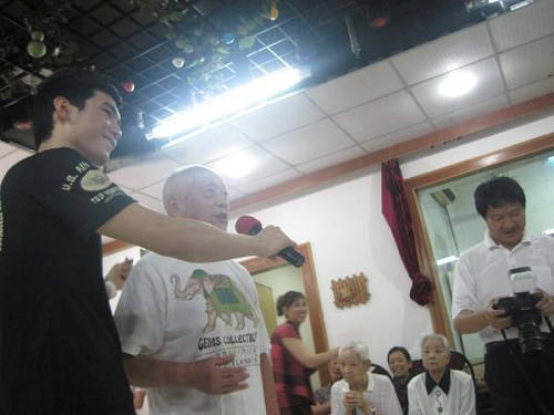 上海电视台的记者也来到了现场,与老人们访谈,与班主任和同学们交流感觉。于是我们邀请各位爷爷奶奶一起来唱一唱歌。“奶奶,月亮代表我的心,您会唱吗?”这位奶奶羞涩的摇着头。 “那奶奶…您平时都喜欢听什么?”“唱戏”“好!那就有请我们这位奶奶为我们唱一段戏好不好!”现场迅速响起一阵掌声……奶奶再三推托,还是为我们演唱了一段沪剧。尽管同学们并不能完全听懂她唱得是什么,但从她口中唱出的每一个字,我们都感受到了怀念与流逝。接着一位可爱的老爷爷也为我们带来了一段京剧演唱。最后一位坐着轮椅的爷爷也愿意为我们唱一段红歌,同学们立即把麦克风递到他的嘴边。爷爷的嘴角在颤抖,发声也很吃力,他喃喃了半天,唱出了 “东……方……红….太……阳…升……”看着这动人的一幕,身旁的同学们落下了眼泪。但实在是不想让爷爷奶奶们看见,于是我们急忙控制自己的情绪,准备表演的开始。