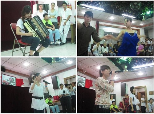 首先上场的是由陈燕青和许立清共同表演的布袋戏浪子回头,她们俩凭借这个剧目在今年的木偶节金狮奖上夺得了优秀奖。热闹的锣鼓声,灵活的木偶表演,老人们看得目不暇接,觉得新奇又有趣。表演结束后,我们还带着布袋木偶走下台去和爷爷奶奶们互动,让他们体会一下“掌中戏”的感觉。紧接着是由张颖带来的舞蹈表演和王楚楚的手风琴独奏,活跃了现场的气氛。表演中,同学们将(克里斯汀)特地为我们提供的中秋月饼递到老人眼前,轻手轻脚地抚摸他们的手,轻言轻语地和他们说话,因为老人容易怕生,我们只得一遍遍告诉她们:“我们来跟您一起过中秋,带了点月饼给您……”由戏导班的程诗文同学表演的戏曲演唱 穆桂英挂帅 恐怕是爷爷奶奶们比较熟悉的节目了,我们看到台下的他们有的甚至跟着唱了起来。李珊珊和徐孙乐表演的国标舞赢得了爷爷奶奶们热烈的掌声。由我班同学自导自演的小品假话真情以敬老爱老为话题,不少坐在前排的爷爷奶奶,都随着演员的表演哈哈大笑,令表演者欧阳福,闫雪,石文慧和柴月感到异常的激动。 王楚楚和李魏婧演唱了一曲城里的月光,缓和了现场气氛,周新亚的琵琶独奏彩云追月表现了我班同学对于中秋的祝福。最后全班一曲大合唱闽南语歌曲爱拼才会赢将整个演出推向最高潮。每一位同学都发自肺腑的激动,为爷爷奶奶,更为生命。演出落幕了, 同学们抑制不住的泪水也在瞬间倾泻了…我想,这一次的演出,是我们大家最难忘最深刻的一次表演。因为在座的这些观众,都是我们想要奉献想要帮助的人。从他们的身上,我们看到了生命的变换,看到了人的脆弱,更是坚强。