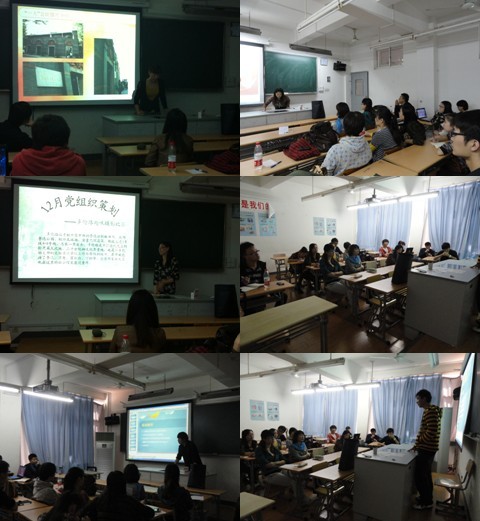 三个小组在现场都进行了精彩的多媒体展示。第一小组负责人杨晓敏同学以“参观中共‘一大’会址策划案”为主题进行讲解。介绍了中共中央“一大”会址,并展示了“一大”会址内部以及外部的图片,以及活动基本路线,并阐述了“希望通过本次活动能让同学们更加了解党史党章,能对党组织的成长过程有充分的认识,能体会到中国共产党人对新中国的期待与对革命事业的执着的精神,同时也使同学们了解上海,熟悉上海”的活动目的。第二小组负责人严梓君同学以主题“百年辛亥——星星之火可以燎原”讲解关于辛亥革命的主题策划活动。他介绍了活动背景“为了庆祝辛亥革命100周年”、活动目的“使同学们了解辛亥革命以及国父孙中山的事迹,同时也了解当时中共的战略路线以及在辛亥革命中的地位”及活动时间地点、参与人以及由“知识问答加上故事阐述“的活动流程,方案另起一点,非常具有新意。第三小组活动“多伦路趣味摄影比赛”由胡丁允同学讲解。首先介绍了多伦路古今变迁:多伦路文化气息浓厚,一个多世纪来,上海走过了从开埠时期的沙船渔村到三十年代的十里洋场直至形成今日东方大都市的沧桑历程,并展示了多伦路的名人和精美建筑图片。活动流程为趣味摄影比赛,将党员与积极分子分成小组,每小组在规定时间内需要拍摄到与先采集好的照片内容相等的图片并要求符合照片反面的特殊处理要求,以内容最丰富,时间最快的小组为胜。她还介绍了活动的经费预算。希望通过此摄影活动能让同学们对中国近代历史有深入了解,对上海的近代文化有充分认识,同时能在参观之余进行对文化的深思。