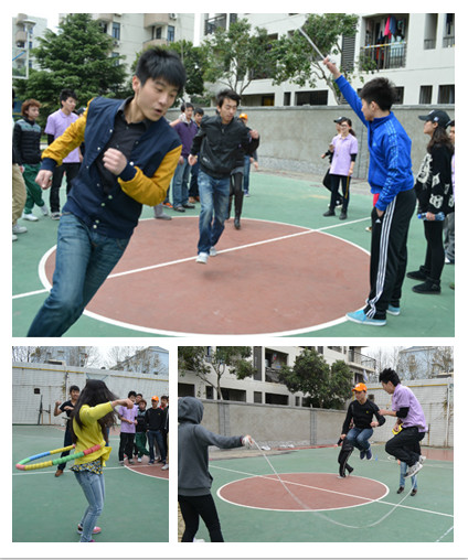 这边斗鸡正角逐激烈,那边的踢毽子难分胜负。大家一阵阵的助威加油声,引发了不少同学的驻足观看,到后来参赛的队伍不断扩大。大摇绳将活动气氛推至高潮,一个个翻飞的身影,灵巧的闪避,绳子拍打在地上的打出的阵阵声浪,使所有同学的都团结到了一起,共同跳跃,忘记学习的烦恼。