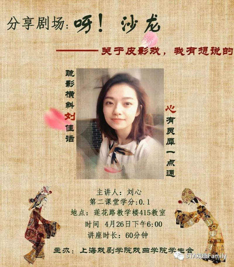 4月26日下午6:00教学楼415教室举办了一次特别的讲座。本次沙龙,15木偶专业的刘心同学从几个方面向同学们详细介绍了皮影戏。包括皮影戏的起源,皮影的三要素、制作过程、雕刻工艺等等。还简单介绍了皮影戏的操作方式,并且和台下的同学进行互动,让同学们亲身感受皮影的趣味性。