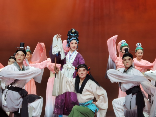 此外,该剧还大胆采用改良创新的水袖表演技法以及舞蹈身段的融入。该剧打破了艺术门类的束缚,转场多次穿插舞蹈动作,将书法和舞蹈这组“姐妹艺术”自然融入到戏曲艺术中。将书法的运笔手法巧妙地与舞蹈动作自然糅合在了戏曲身段中,提高了剧目的舞台观演性。该剧试图以戏曲融其它艺术的跨界创新营造出立体表演场域,尝试打造新的程式组合,探索守正创新的新模式,使观众领略到东晋时期那一段难忘动人的师生情缘,一代书法大家拜师学艺的成长历程。该剧由李崇林先生担任编剧,所创剧本有着很强的文学性与文化性,唱词和念白清新脱俗,朗朗上口,其中不乏闪耀着诸多中国传统文化的光芒,剧本中所显现的文化元素与戏曲表达可谓相得益彰。值得一提的是该剧的舞美也让人眼前一亮,舞台上不再是传统定义下的一桌二椅,反而运用了话剧的元素,给观众带来了戏曲新体验,同时引人深思。