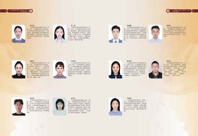 民族器乐类,二胡2人,琵琶1人,古筝2人,扬琴1人,竹笛1人,笙1人。