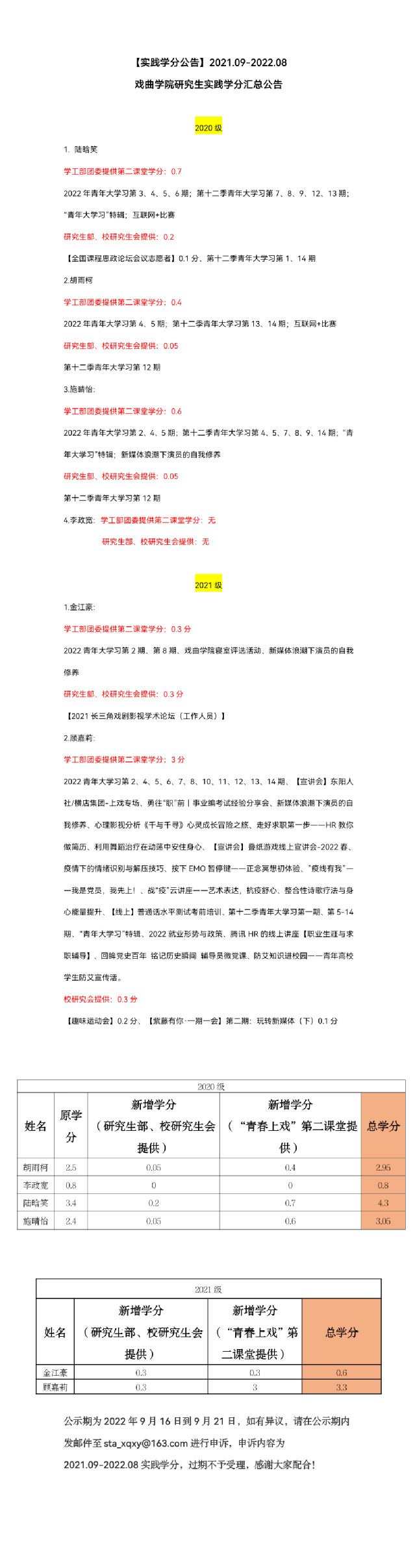 【实践学分公告】2021.09-2022.08 戏曲学院研究生实践学分汇总公告