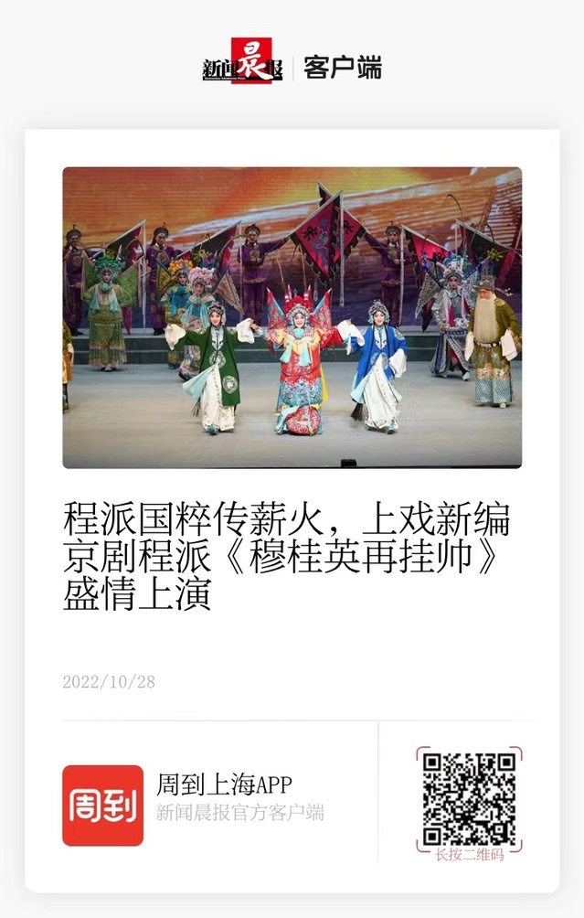 新编京剧程派《穆桂英再挂帅》是上戏全体师生热烈庆祝党的二十大胜利召开的诚意之作,也是新老艺术家薪火相传、铸魂育人重要成果。