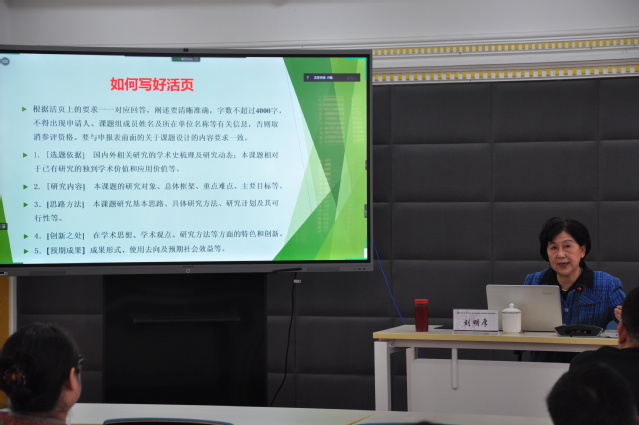 在之后的讲座中,刘明厚教授强调了申报者需要格外重视的政治导向问题,并向大家详细讲解了具体的申报条件和申报要求。此外,刘教授从课题名称需规范严谨、要确定项目类别、选题要有社会价值和学术价值以及选题可行性考察几个方面谈到了有关申报的技巧与重点。同时,她与大家围绕选题依据、研究内容、思路方法、创新指出和预期成果几个方面探讨了“如何写好活页”的关键问题,并分享了有关申报的几点建议,如申报者要注意研究目标、研究内容和拟突破的重难点;要重视前期研究基础和资料准备情况;研究思路要有框架设计等。