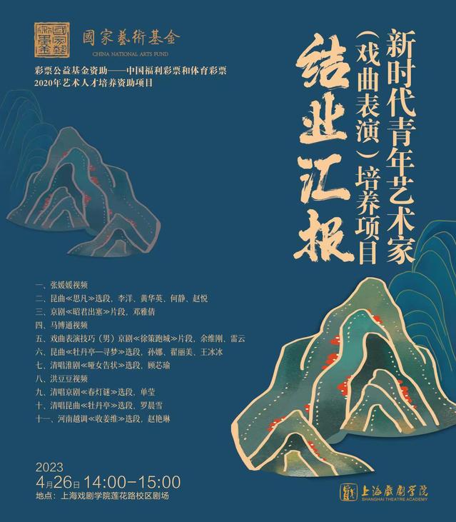 演出时间:2023年4月26日 国家艺术基金2020年度艺术人才培养资助项目—新时代青年艺术家(戏曲表演)培养项目结业汇报