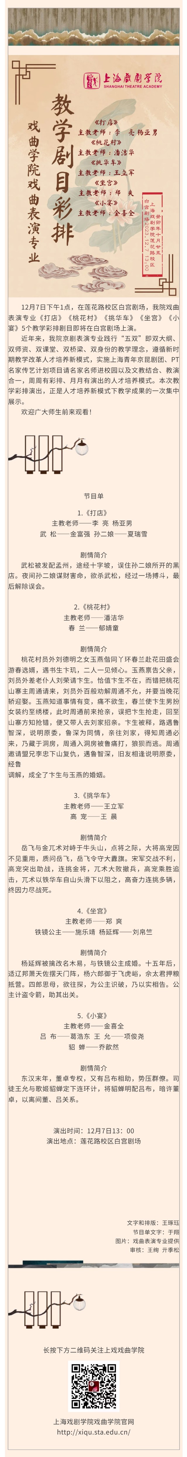 演出预告 | 戏曲学院戏曲表演专业教学彩排剧目《打店》《桃花村》《挑华车》《坐宫》《小宴》即将上演
