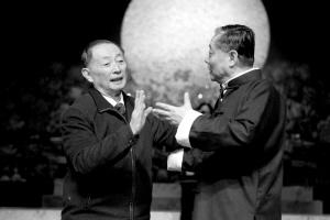 在前天的排练中,梅葆玖和张学津为青年组演员做示范。
