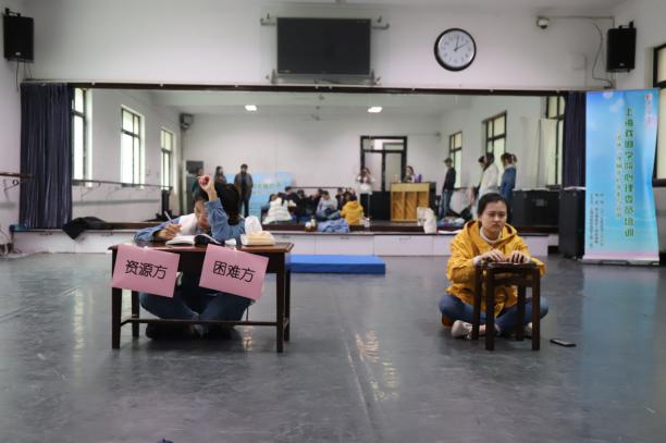 5分钟时间每组排出一个心理剧,要求是用哑剧的方式,可自选现场的道具,来呈现学习生活中遇到的困难和压力,设有主持人,困难方,资源方,每组成员都有自己的角色。同学们认真讨论,效率极高,可谓是惊喜连连。