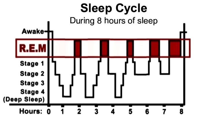 非快速眼动睡眠期(NREM)和快速眼动睡眠期(REM)交替出现,交替一次称为一个睡眠周期,两种循环往复,每夜通常有4~5个睡眠周期,每个周期90~110分钟。