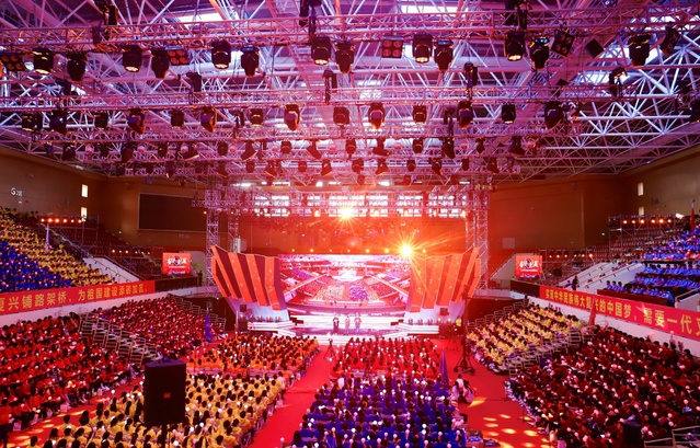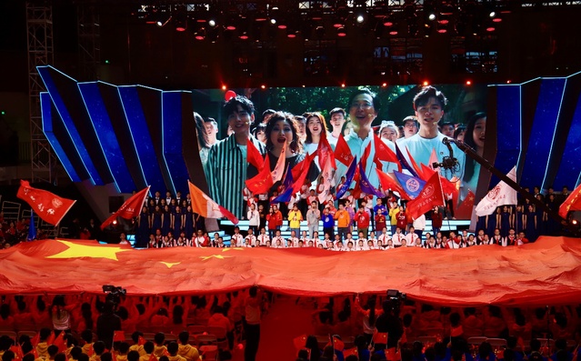 现场18个学生方阵还围绕“歌唱祖国”“校歌嘹亮”“青春颂歌”“唱响未来”4个主题进行了拉歌展示,跃动的歌曲、振奋的口号将歌会一次次推向高潮。