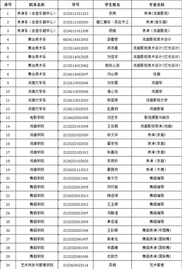根据《财政部 教育部 人力资源社会保障部 退役军人部 中央军委国防动员部关于印发<学生资助资金管理办法>的通知》(财教〔2021〕310号)、《上海市教育委员会 上海市财政局 上海市退役军人事务局 上海市人民政府征兵办公室关于印发<上海市普通高等学校学生资助资金管理实施办法>的通知》(沪教委规〔2025〕8号)、《上海市教育委员会关于下达2025年学生资助补助计划(高等教育)的通知》(沪教委学〔2025〕45号)、《上海戏剧学院国家励志奖学金管理办法》(上戏院发〔2025〕20号)等文件精神,本着“公平、公正、公开”原则,经过学生自主申请、二级院(系)审核推荐、学生处复核、校奖学金评审委员会和领导小组集体审议,拟推荐以下30名同学获得2024-2025学年国家励志奖学金。