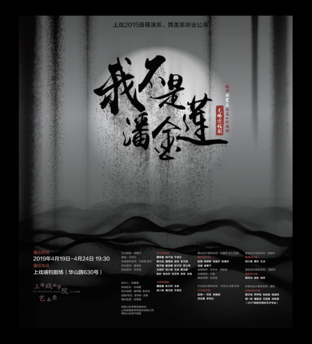 2019年4月19-24日,根据刘震云同名小说编创,由上戏2015级导演系、舞美系联合创作,上戏演艺中心精心制作的无场次话剧《我不是潘金莲》,在上戏端钧剧场成功演出。该剧作为上戏的毕业公演剧目,是“上海戏剧学院艺术季”着力推出的一部重磅作品。