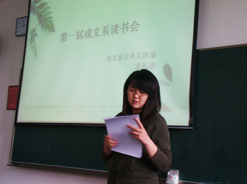 2010年04月22日中午12:00,由戏文系学生会学术实践部主办、宣传部承办的第一届戏文系读书会在红楼207如期举行,本次活动旨在通过读书会这一形式,为我校戏文系学生创造更加良好的学习氛围。本活动一经推出,立即得到了09戏文班同学们积极响应并出席了本次活动。