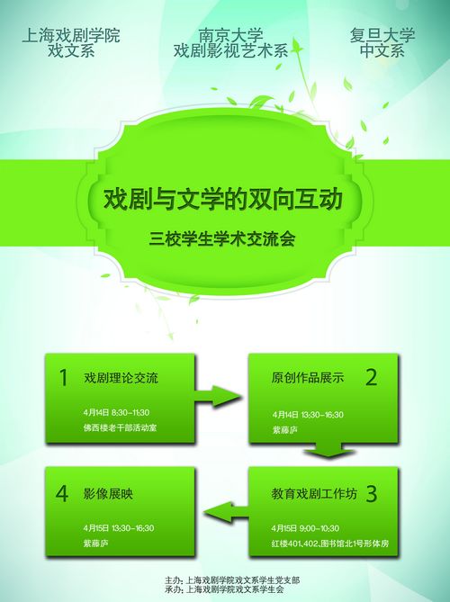 由我系学生党支部、系学生会主办的“戏剧与文学的双向互动——三校学生学术交流会”将于4月14日(周六)、4月15日(周日)热烈举行。届时,来自我系以及复旦大学中文系、南京大学戏剧影视艺术系的同学将齐聚一堂,进行戏剧理论、原创作品、教育戏剧工作坊等多方面内容的研讨和展示,请有兴趣的同学积极参加。