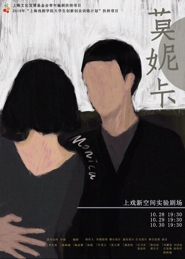 2019年10月28-30日,戏文系17级学生陶易赟原创话剧《莫妮卡》在上戏新实验空间剧场成功上演。该剧获得上海文化基金青年编剧项目以及上海戏剧学院“创新计划”的扶持。戏文系李世涛老师担任指导老师,另除戏文系17级学生陶易赟担任编剧外,导演系17级学生陈皓楠担任导演,戏文系17级学生汤斌担任制作人,其余成员均来自上海戏剧学院17-19级学生。