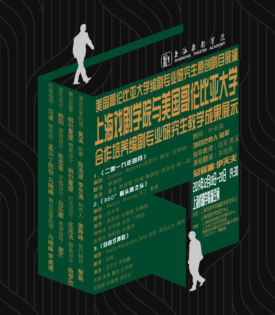 本次演出由上海戏剧学院编剧学研究中心、上海戏剧学院演艺中心出品,包括了《二零一九年四月》(April Twenty Nineteen)、《360°猫头鹰之头》(360°Owl’s Head)《自由式摔跤》(Lucha Libre),分别由哥大专业编剧研究生丹尼尔·欧文·拉特纳、马丁·默里、宝拉·亚历山大·索托所作,并在中方导师陆军教授、黄溪教授的指导下搬上舞台,总导演为伊天夫教授。本次演出的剧目分别由上戏编剧学硕士生顾潇扬、博士生刘才华、硕士生於闻负责剧本翻译。《二零一九年四月》里每一个故事的灵感都来源于作者所处的环境,或受到了某些事件的启发,有的故事甚至比事件真正发生的那天更加真实,此次展演选取了其中的三个片段,分别为《修车》、《朋友》和《别走》,表达了人们内心深处的爱与愿望;《360°猫头鹰之头》讲述的是一位地产经纪本杰明·霍姆先生的传奇故事,他想拥有一个可360°旋转猫头鹰的头,遍寻不得然后死去。本杰明沉睡的欲望被偶然唤起,也因无法满足的欲望而死去,这是作者对人生的欲望和需求的反思;《自由式摔跤》是关于一位多米尼加小女孩亚涅莉兹的故事:她从小梦想成为一名摔跤手,却遭到家庭的反对和现实规则的限制,但她始终不曾放弃梦想并努力登上了擂台。该剧故事的背后,是作者独特的民族记忆和女性身份认知,能够引起观众强烈的共鸣。