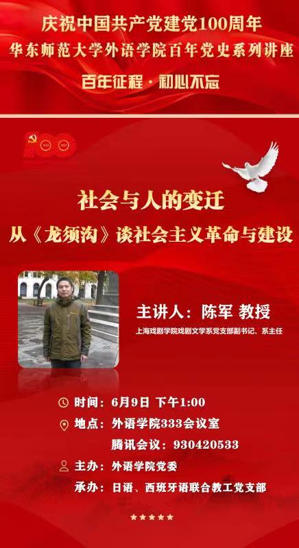 2021年6月9日,我系陈军教授受华东师范大学外国语学院党委邀请做题为“社会与人的变迁——从《龙须沟》谈社会主义革命和建设时期时期成就”的主题讲座。为庆祝中国共产党成立100周年,华东师范大学外语学院党委举办了“百年征程·初心不忘”党史系列讲座,本次活动为系列讲座的第三场,由日语系、西班牙语专业联合教工党支部承办,主要围绕社会主义革命和建设时期时期成就开展党史学习。讲座以线上线下相结合的方式开展,由日语西班牙语联合教工党支部书记陈凌虹主持。