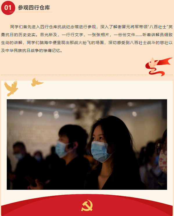 2021年4月15日下午,上海戏剧学院戏文系20级戏剧教育团支部来到四行仓库开展“红色基地打卡计划”第三站。抗日战争是中华民族和中国人民永远不能忘却的一段历史,步入新时代的青年们更应该深入了解那段充满硝烟和战火的血泪史,而发生在苏州河畔的那一场四行仓库保卫战,正是我们这一次去探寻的目标。