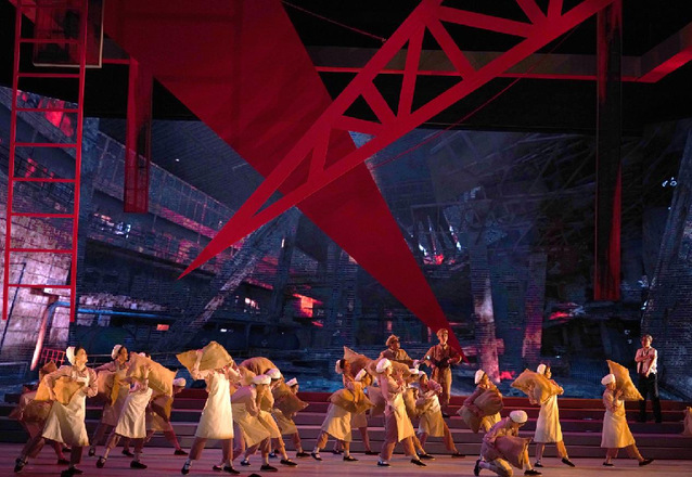 该剧的导演处理和舞台呈现,尤其在空间调度和舞美效果方面,显得简洁、流畅而又大气,富有科技感和现代感。借助背景LED大屏、前景垂帘投影屏播放的画面,配合多个群舞场面,该剧展开了恢弘的历史画卷,让人看到了上海解放之初依然严峻的军事、政治、经济等多方位的斗争。尤其是对“二六大轰炸”事件的表现,现场效果令人震撼。在特务的配合下,国民党飞机精准轰炸了上海的多个电厂,导致上海的工业生产和居民生活受到严重影响。陈毅市长不仅动用各方专业人才,争分夺秒修复电机、锅炉等核心部件,同时还动员广大工人阶级,肩扛手提、依靠人力为电厂源源不断输送煤炭,短短42个小时之内就让电厂恢复了供电。如此大空间的舞台调度、多媒体的综合运用,有力地拓展了传统戏曲的时空表现手段,让观众既能欣赏到戏曲的优美唱腔和细腻表演,过足戏瘾,又能像看电影大片一样,置身于翻天覆地的社会巨变,感悟沧海桑田。