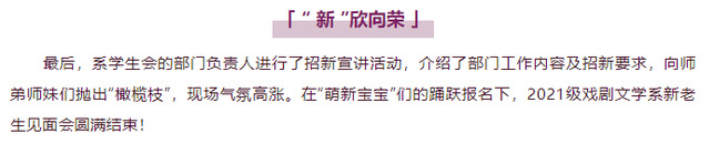 新老生见面会其乐融融,感觉自己进一步了解了戏文系这个大家庭,收获了很多干货、很多温暖!我印象最深的是袁海因师姐和陈思源师姐的学习分享,收获颇丰,希望以后可以在学习中慢慢体会。非常感谢各位师兄师姐的全面介绍,使我知晓了很多之前从未关注过的比赛和学生活动。总之,今天很开心,很期待自己的大学生活!以后一起快乐地学习玩耍!