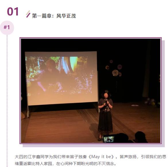 整场晚会共分为“风华正茂”、“上下求索”、“不负韶华”三个篇章,包含了器乐演奏、对唱、舞蹈与昆曲表演等节目形式,其间穿插了抽奖互动环节,在惬意氛围里带来极佳的视听享受。