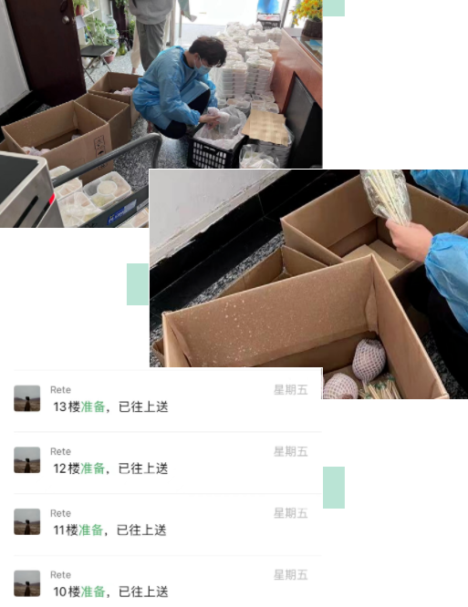 这是第二天在一楼统筹时拍摄的照片。志愿者们需要根据此前后勤统计的送餐份数,按照每个楼层、每个宿舍的数量一一清点。每清点完一层的份数,志愿者都会在群里及时更新配餐进度,“几楼准备送上去了”、“几楼的同学胃不好放的是馒头”等。直到确保每个楼层、每位同学都拿到餐饭后,志愿者同学才会放心。