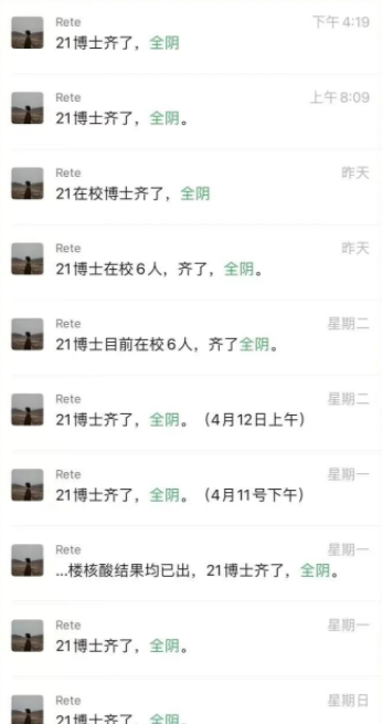 之后,我的志愿者工作完全转战到了线上:每天统计用餐情况、更新餐饭数量、关心防护服是否到位等。最想听到、看到的就是层长群里那一句“x层没问题”,班群里一天两次统计的“抗原结果全阴”类似这些话语。