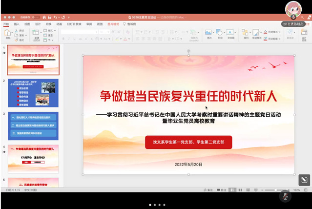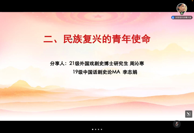 2022年5月20日晚19:00,上海戏剧学院戏剧文学系学生第一党支部、第二党支部在腾讯会议线上平台举行“争做堪当民族复兴重任的时代新人”主题党日活动暨毕业生党员离校教育。本次活动邀请刘明厚教授发表主题演讲,戏文系党总支副书记陈莹老师、学生第二党支部书记刘莹莹老师、学生第一党支部书记管润青老师与学生党员、入党积极分子参与会议,主题党日活动由刘莹莹老师主持。