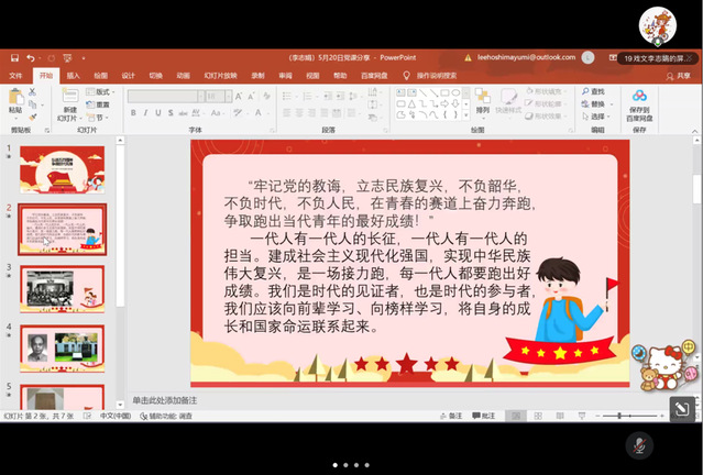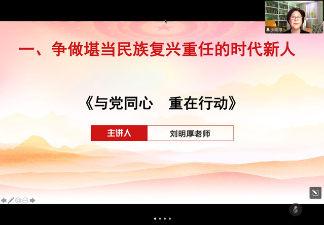 刘明厚老师带来题为“与党同心 重在行动”的主题发言。刘明厚老师是戏剧文学系教授,也是戏文系“关心下一代”小组的成员,她从“关于堪当民族重任的思考”、“疫情下的选择”、“学会换位思考”三个方面娓娓道来,为我们分享如何争做堪当民族复兴重任的时代新人。