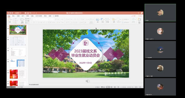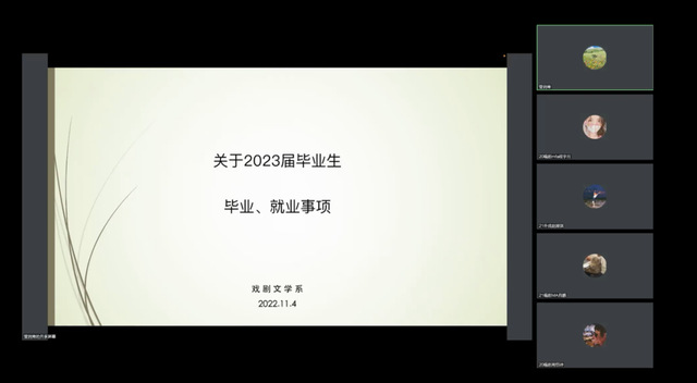 2022年11月4日下午一点,就业政策解读与求职案例分析——戏文系2023届毕业生就业动员会在线上顺利举行,本次动员会由戏文系研究生辅导员刘莹莹老师主持,近100位戏文学子共同参与到此次线上活动讲座中。