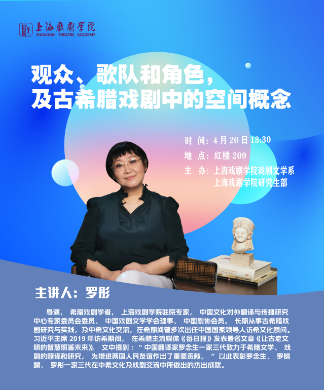 在这个春暖花开的四月,上海戏剧学院戏文系如愿再次邀请到导演、希腊戏剧学者罗彤老师来到校园并举办古希腊戏剧系列专题讲座。罗彤老师长期从事古希腊戏剧研究与实践及中希文化交流事务,对古希腊戏剧有着深刻且独到的理解。作为戏文系特别引进的PT艺术家,始终与戏文系师生保持友好的交流与合作关系,曾多次在校园中开展古希腊戏剧相关活动与课程,在拓展学生知识面、加深对经典戏剧作品的理解的同时,也将古希腊戏剧乃至古希腊文化中崇高的精神追求带入校园,带入同学们的内心。同时,在希腊生活的经历也使她对当地的风土人情有着切实的体验,常常用生动活泼的方式与学生分享见闻轶事,自由风趣的氛围是她课堂的标志性特点。在2022-2023学年上半学期,我系邀请罗彤老师为20级戏文班级开展为期九周的古希腊戏剧概论课程,尽管由于疫情原因遗憾转为线上课程,但仍然使20级同学获得了丰富的知识与不可多得的学习体验。本学期疫情基本结束,柳暗花明,经过双方的多次沟通,再次在我校开展共三次的古希腊戏剧系列通识讲座,欢迎在校师生积极参与。